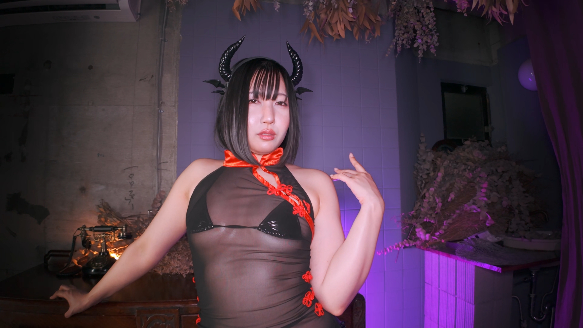 衣装:透け透けチャイナドレス、サキュバスエナメルビキニ、ぬるテカローション